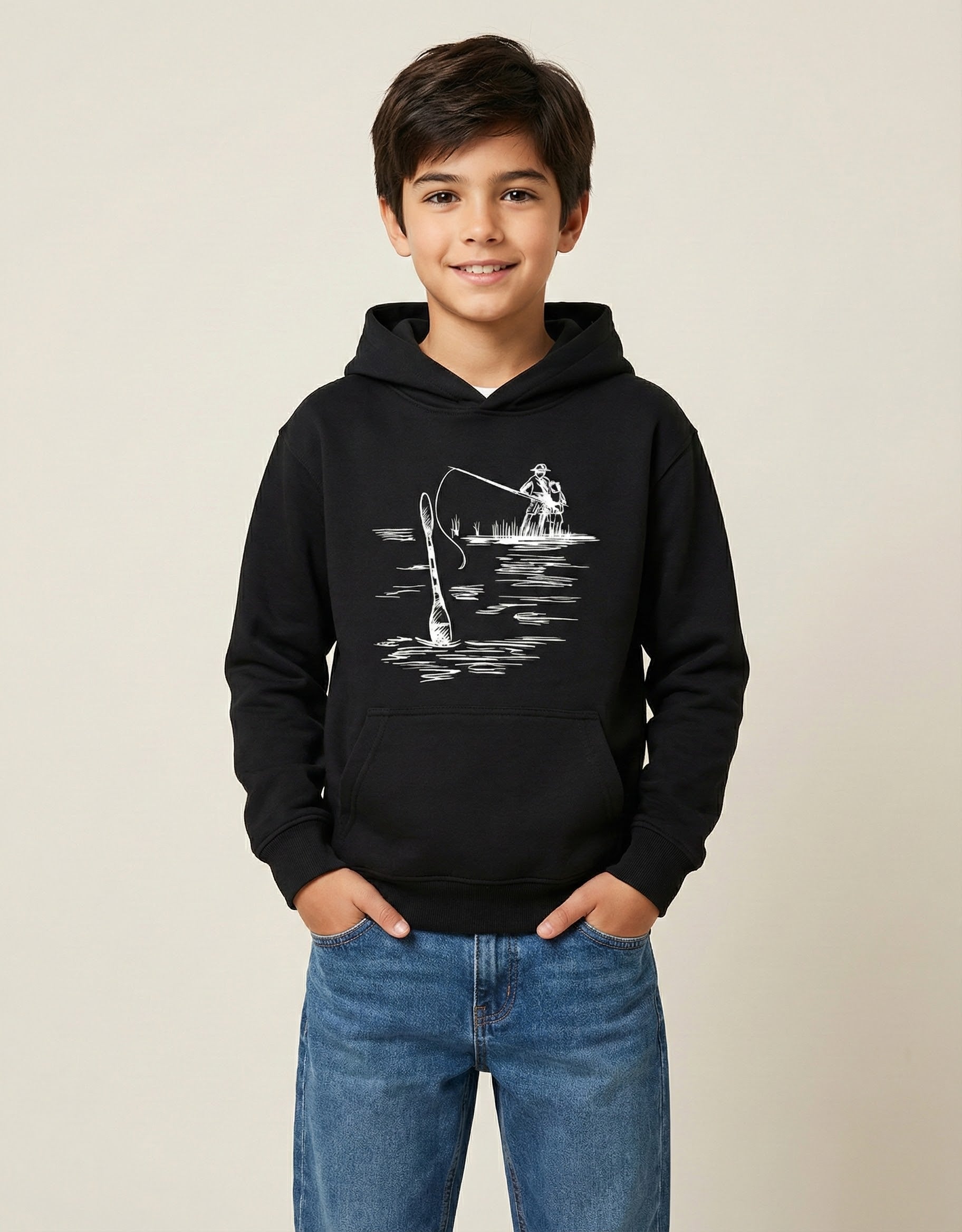 The minimalist, monochrome aesthetic makes this hoodie incredibly versatile. The high-contrast black ink design stands out sharply against the crisp fabric, offering a look that is both modern and nostalgic. Whether you’re an avid angler or a lover of fine line art, this design speaks to the soul of the great outdoors.