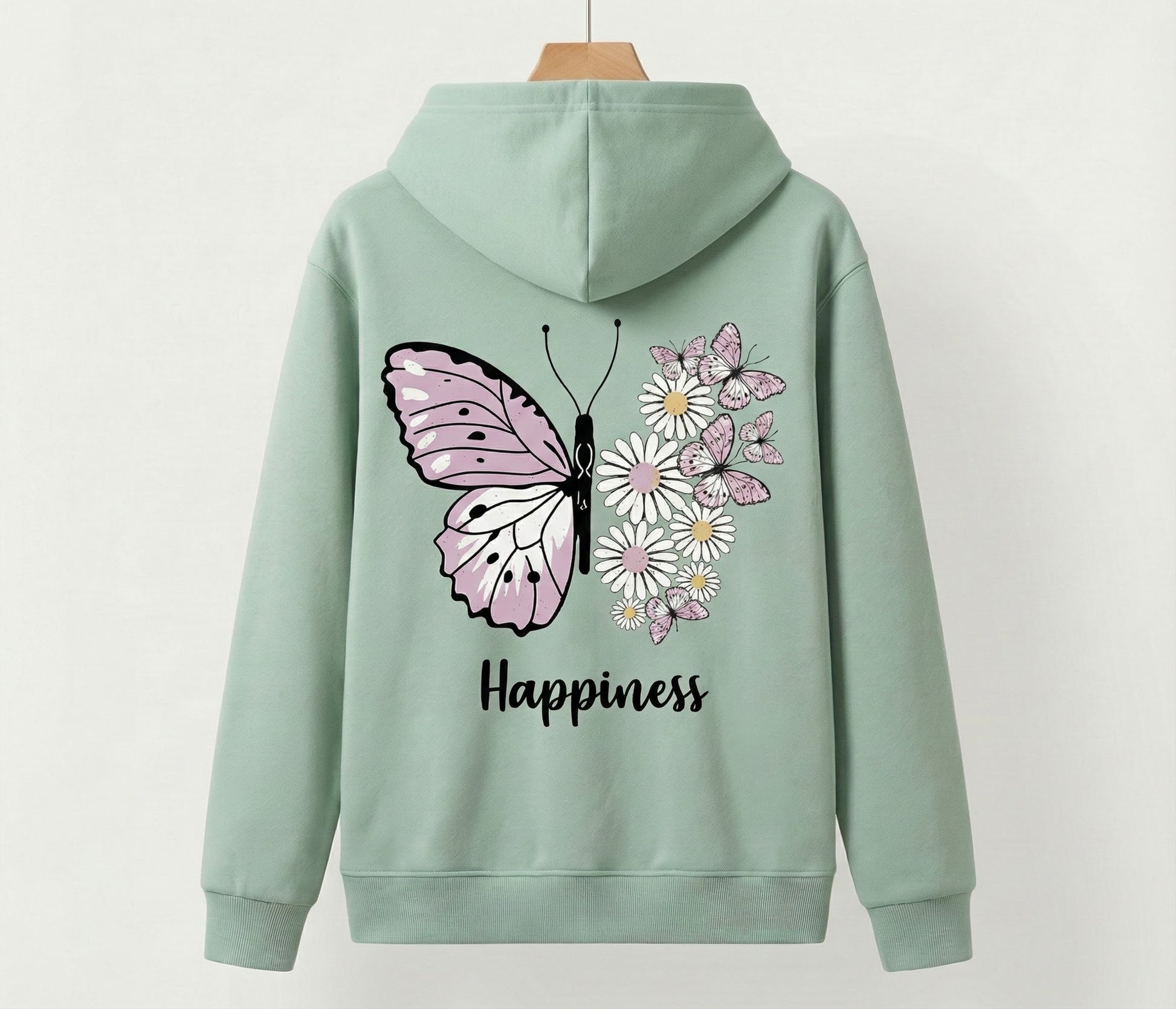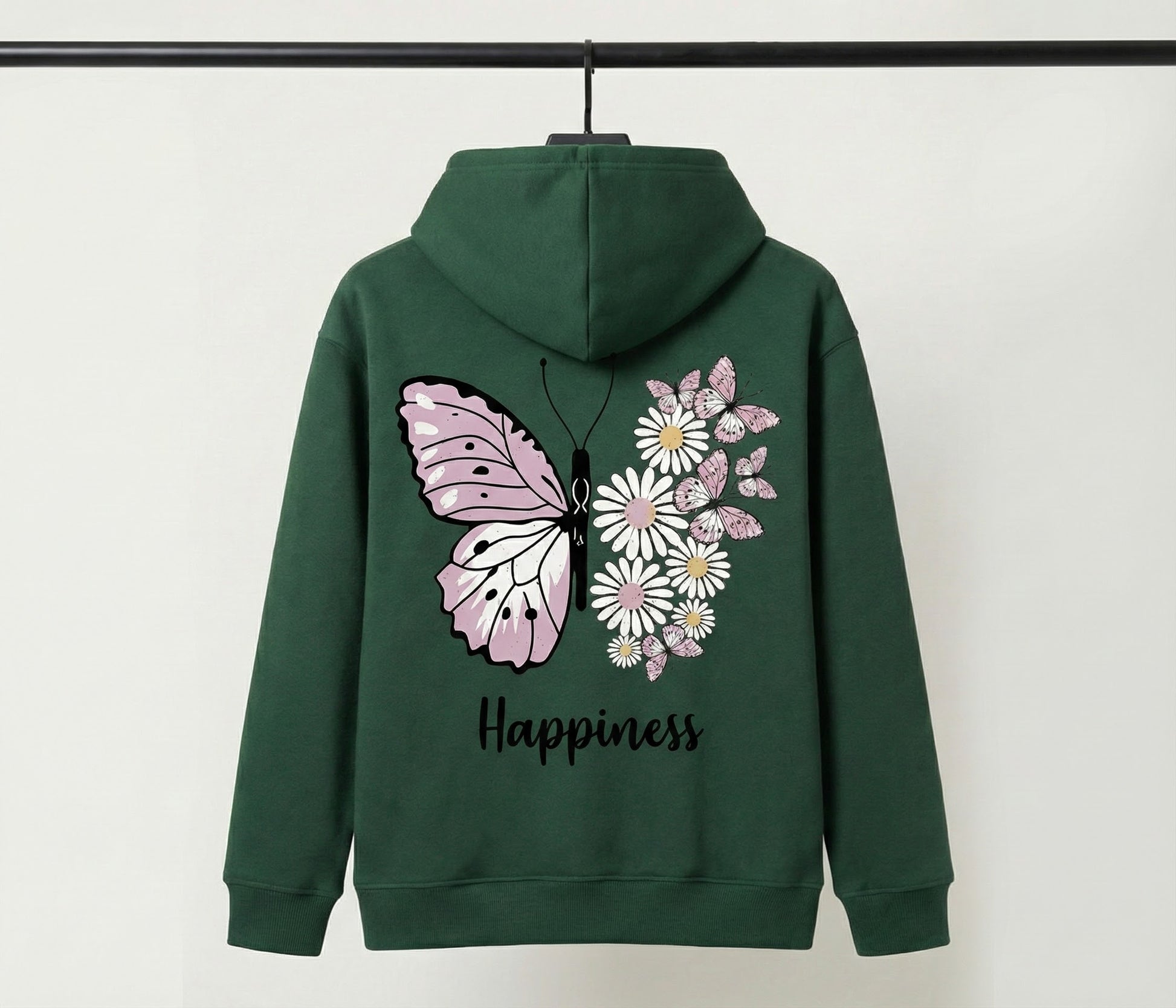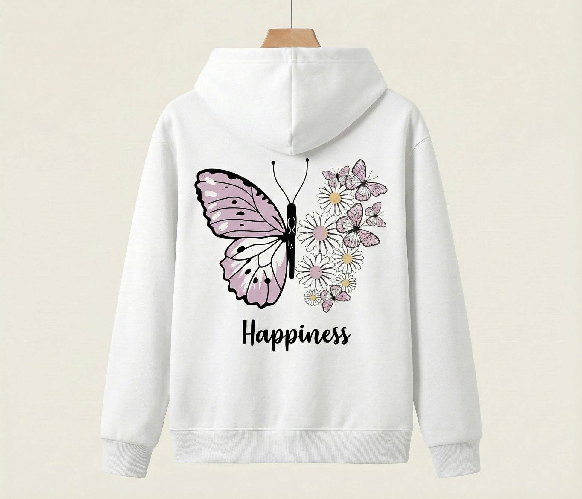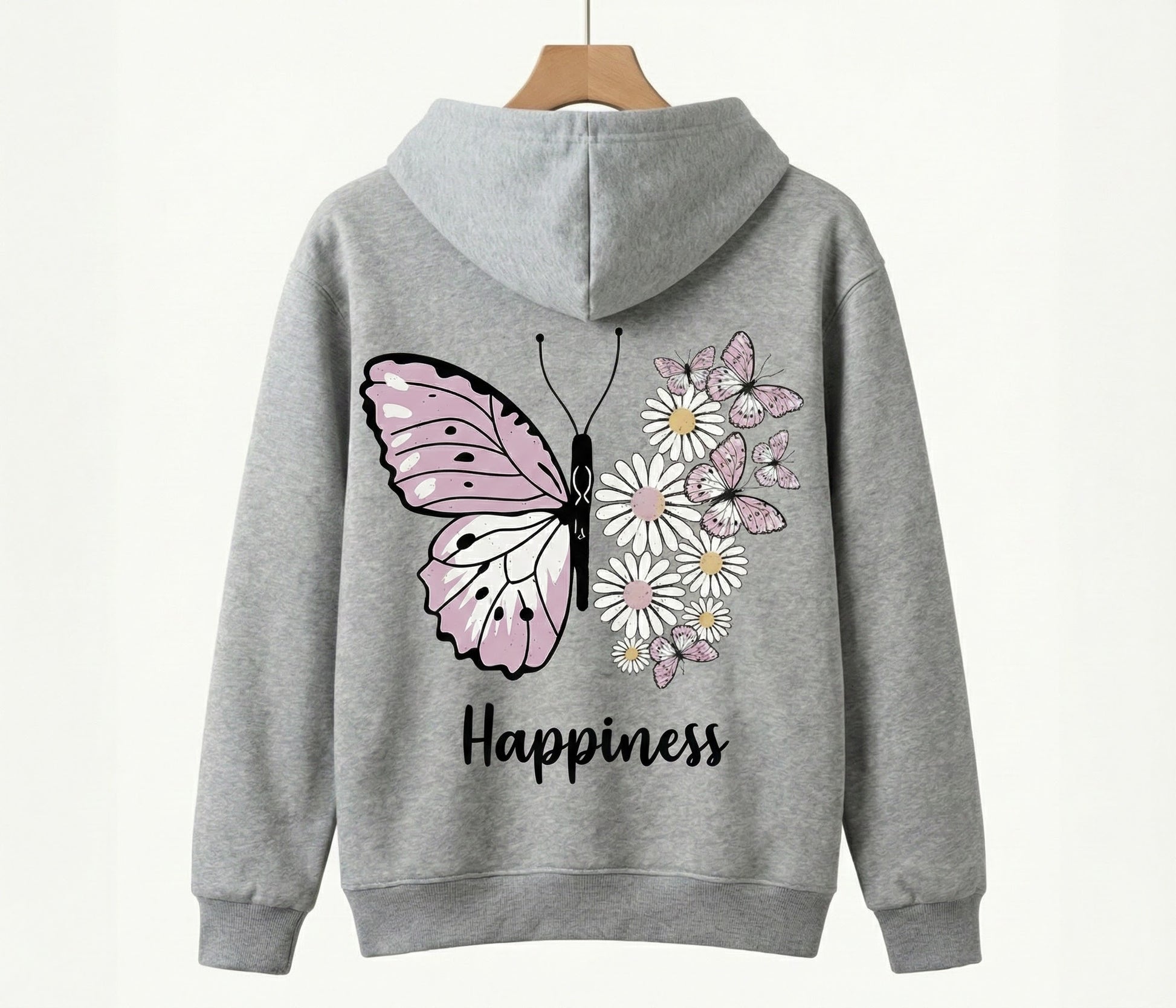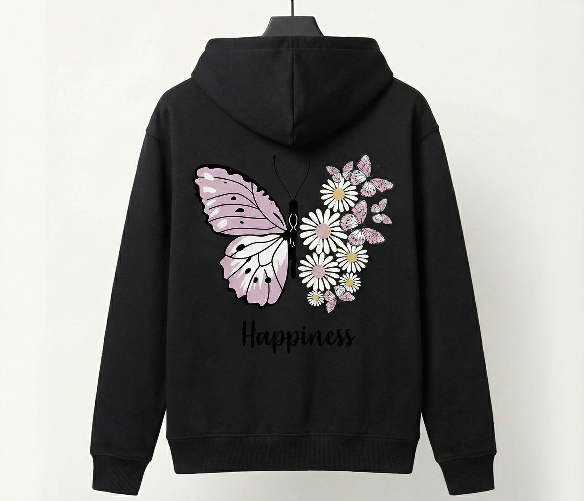 Our "Happiness" Butterfly Hoodie is designed to be a daily reminder of growth and beauty. Featuring a unique split-wing design where nature meets art, this hoodie combines delicate pastel pinks and daisies to create a look that is both edgy and sweet.